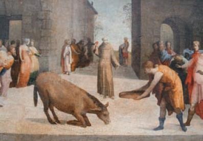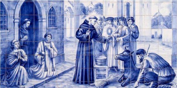 Oh, prodígio! Sem prestar qualquer atenção no alimento que lhe é oferecido, não escutando senão a voz de Frei Antônio, o animal se inclina ao ouvir o nome de Jesus Cristo e depois se prostra de joelhos diante do Sacramento de Vida, como para adorá-lo.